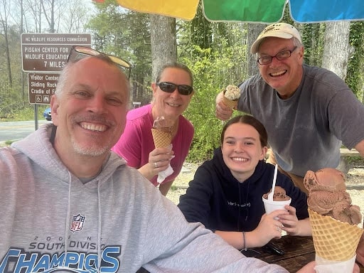 Mid-month, we took the RV for a long weekend visit to Jason’s brother in Hendersonville, NC (near Asheville). Our RV can serve as an extra bedroom so we can bring our “traveling hotel room” and stay in his driveway. The reason for this trip was to watch our niece in Beauty and the Beast. Of course, she was amazing! We were also able to do some hiking in the Pisgah National Forest and saw beautiful waterfalls. After our walkabout, we had to stop at my favorite ice cream joint, Dolly’s Dairy Bar, in the Pisgah Forest. Dolly’s is only open about half of the year, so if there’s an opportunity to go, I always take it. The ice cream is homemade, and they have all kinds of crazy flavors. Most are named after local places and summer camps that bring the children over in busloads.