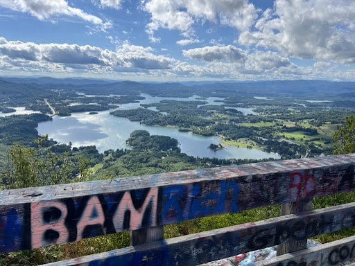 We relaxed along the river while I read and Jason fished. On the last day, we drove to the top of Bell Mountain, which provided a great 360-degree view of the surrounding lakes. There was a huge staircase that offered an even better view if you were willing to climb it. There we saw something we had not seen before. Most of the rocks and the decking were covered in graffiti. It made for an unusual sight, but it didn’t ruin the panorama.