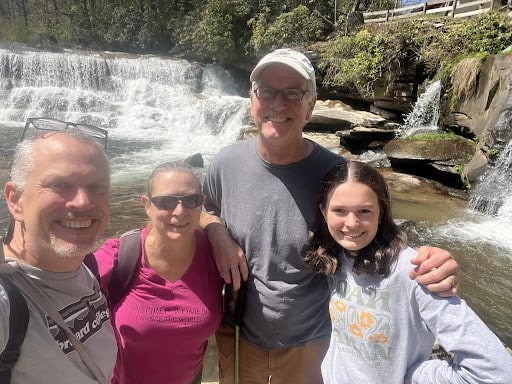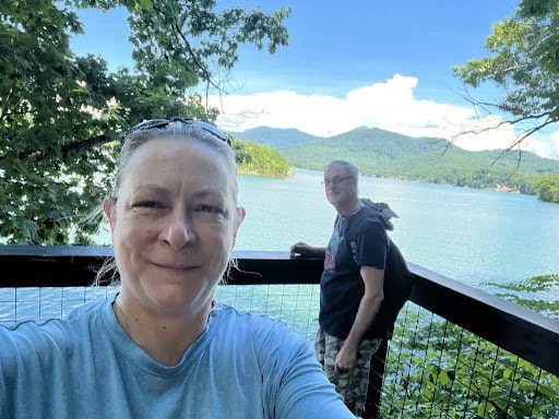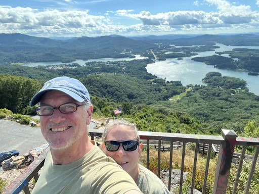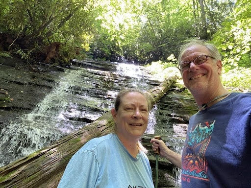 As spring turned to summer, the weather became too hot in Marietta, so we headed in the RV to the North Georgia Mountains for some cooler air. We took our RV to the Mountain View Campground in Hiawassee near Lake Chatuge. It was our first visit there. The small and quiet location had a nice view of the mountains and fun places to explore nearby. The friendly hosts told us about a secret waterfall just down the road. To get there, we put our Subaru to the test, crossing three streams and then walked up a steep hill to discover a lovely waterfall all to ourselves.