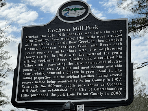 We explored a new nearby place called Cochran Mills Park. It’s an 800-acre park in Chattahoochee Hills, just 20 miles southwest of the Atlanta airport. Though it’s not far from the hustle and bustle of the city, it feels a world away. The area is peaceful and quiet, with trees abounding and waterfalls to see. There are many trails to choose from for hiking and riding (bikes or horses). Historically, this area was filled with three grist mills.